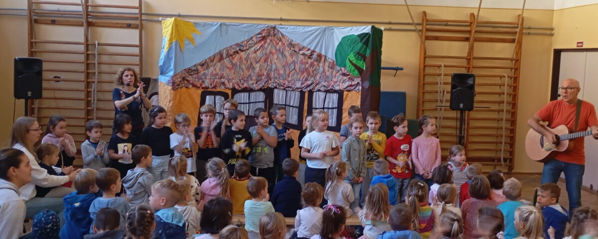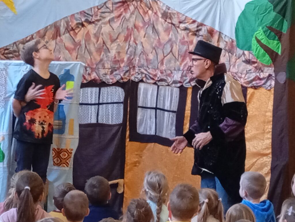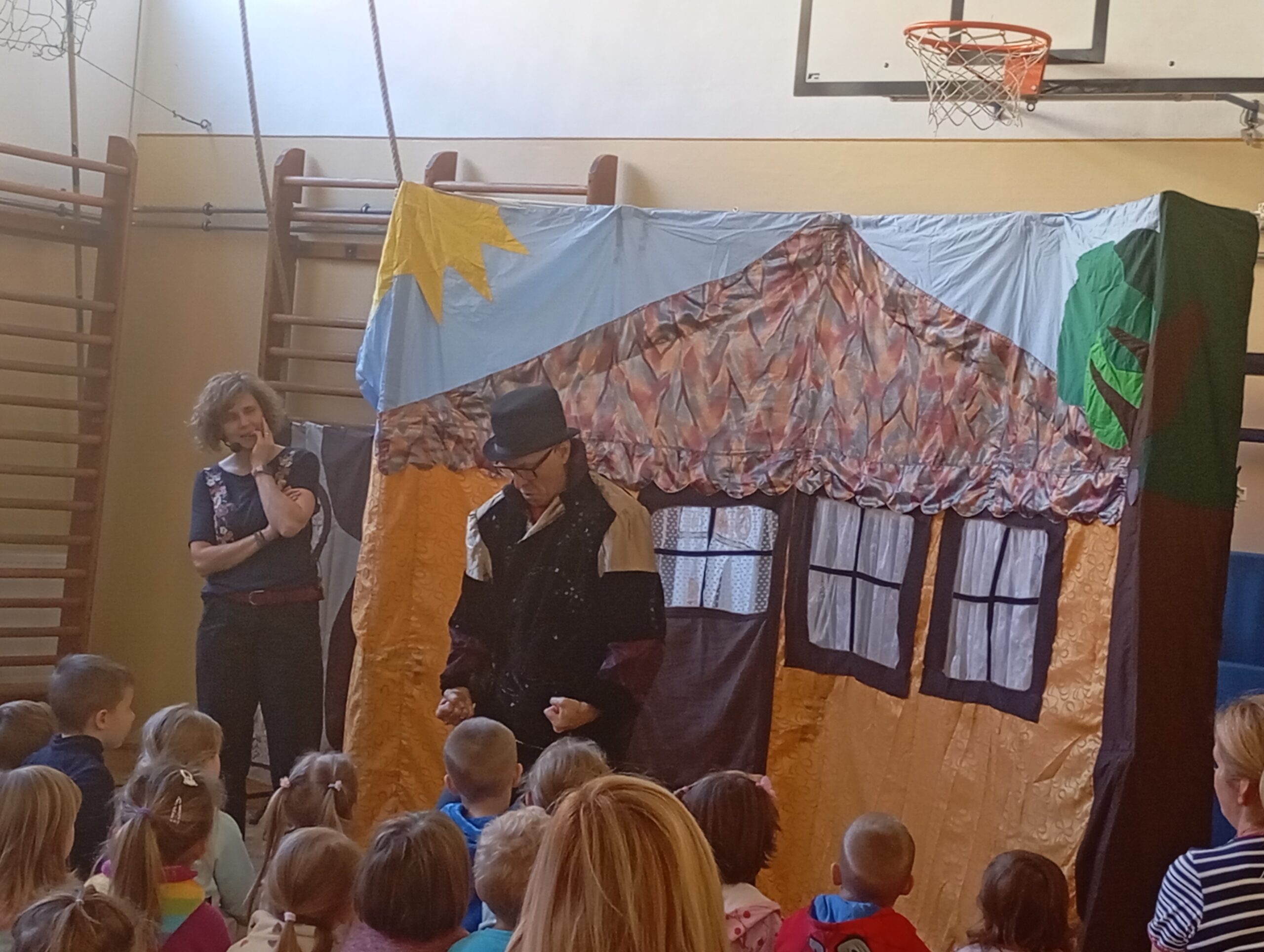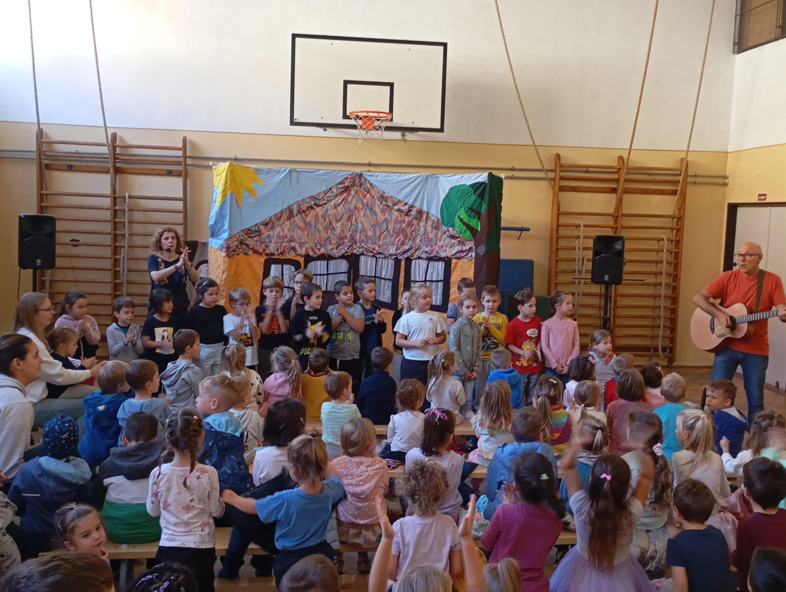Iskolánk tornaterme pillanatok alatt színházzá alakult, ahol Figura Ede és társa „A farkas és a hét kecskegida” című mesét adták elő egy kicsit magyarul, egy kicsit németül, sok -sok kedves dallal, zenével, amivel remek hangulatba repítették a nézősereget.