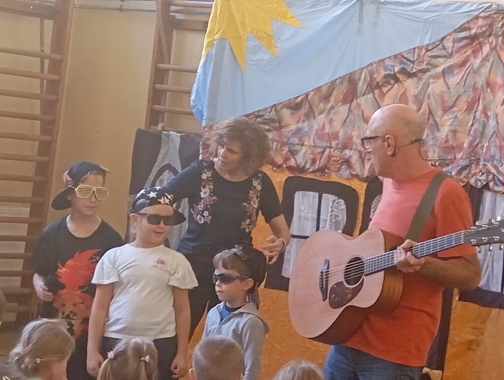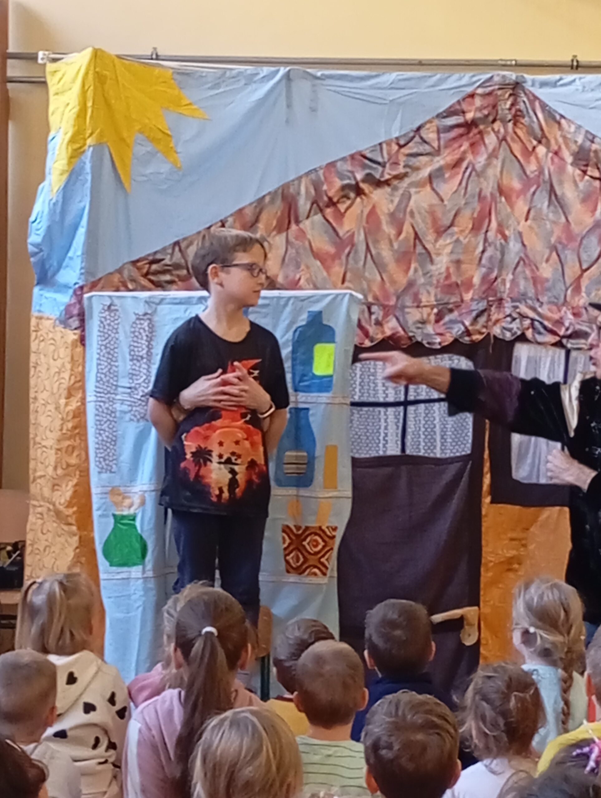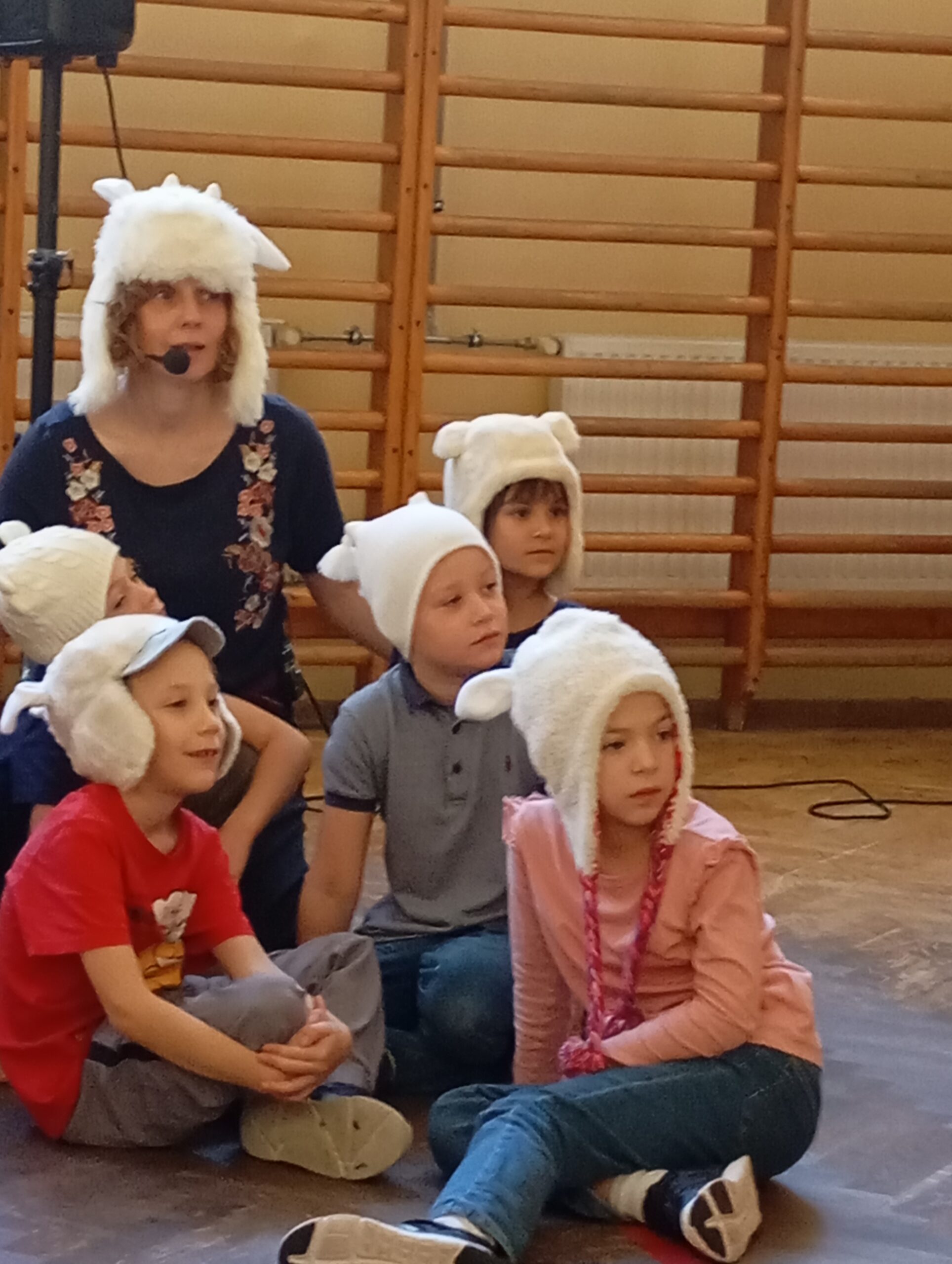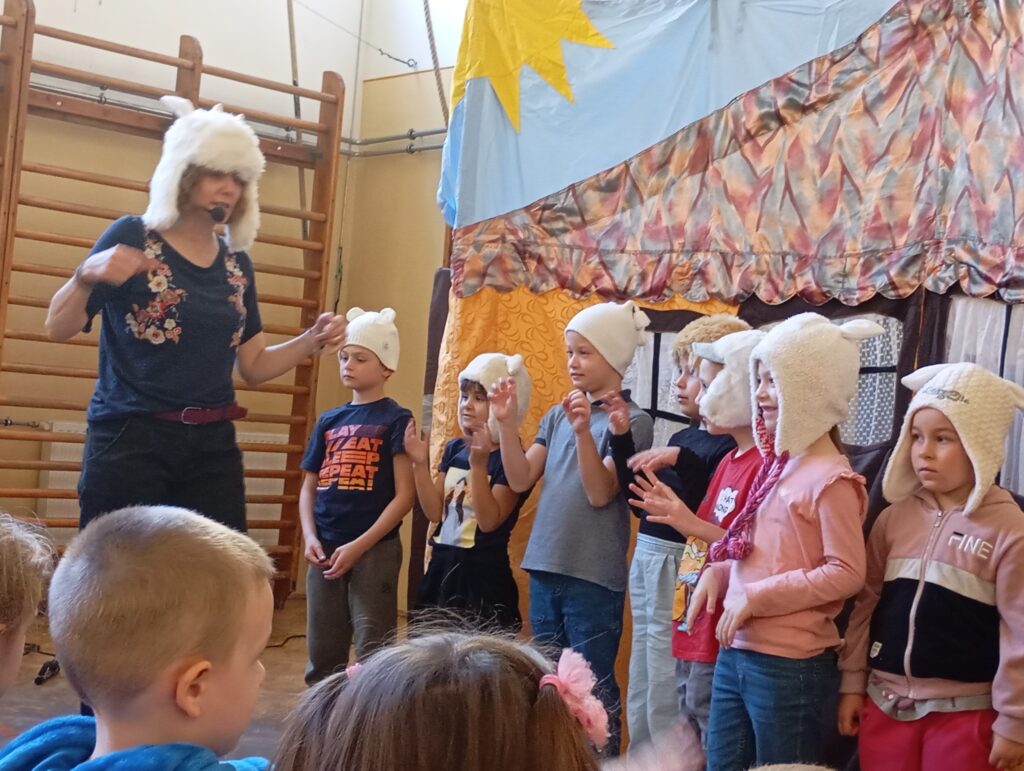 Iskolánk tornaterme pillanatok alatt színházzá alakult, ahol Figura Ede és társa „A farkas és a hét kecskegida” című mesét adták elő egy kicsit magyarul, egy kicsit németül, sok -sok kedves dallal, zenével, amivel remek hangulatba repítették a nézősereget.