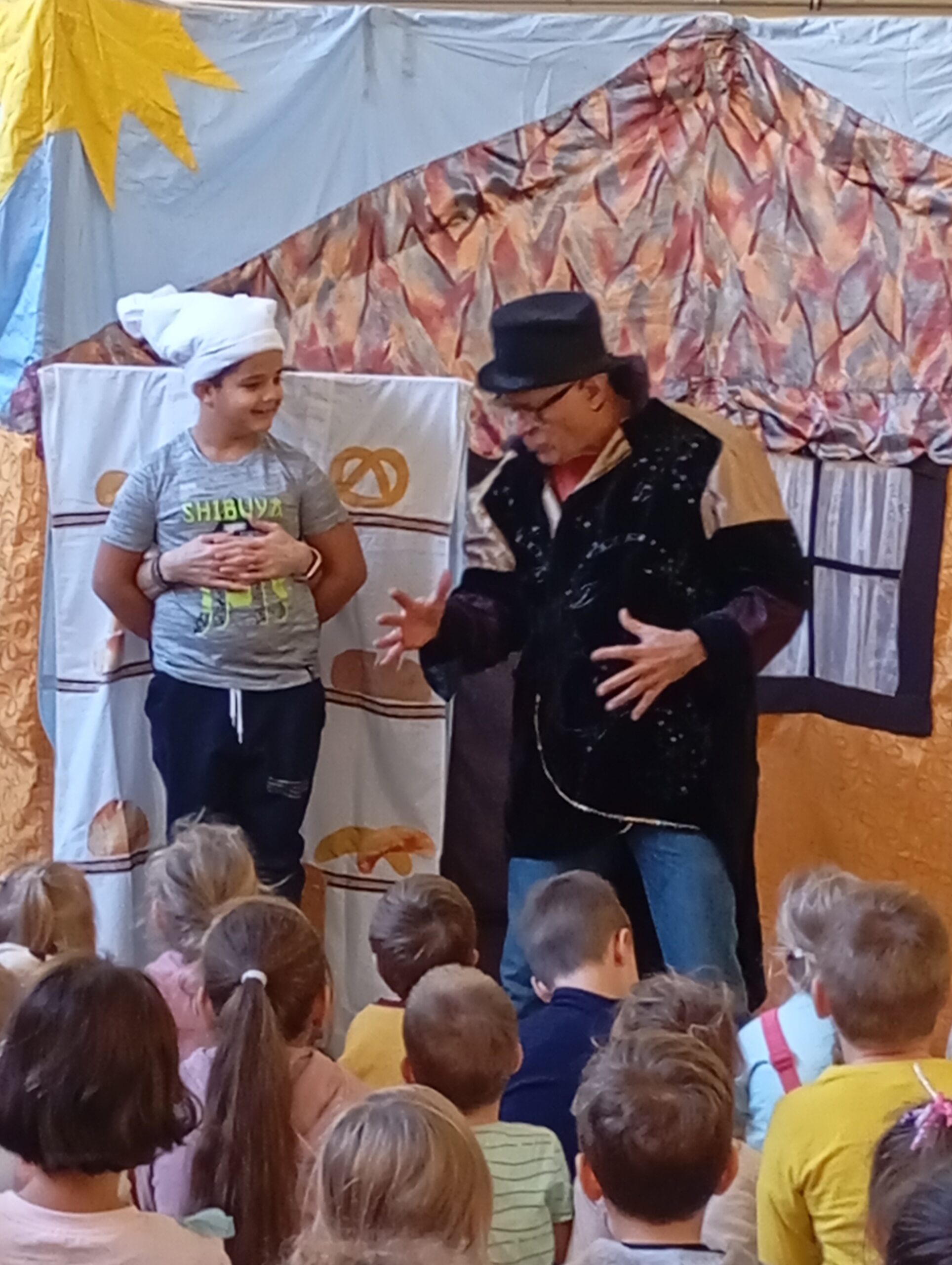A pesterzsébeti Német Nemzetiségi Önkormányzat jóvoltából egy szenzációs kis műsoron vehetett részt az 1.c és a 2.c, két német nemzetiségi osztály. Nagy örömünkre a Baross Kindergarten-oviból is eljött hozzánk 60 kisgyermek megnézni az előadást.