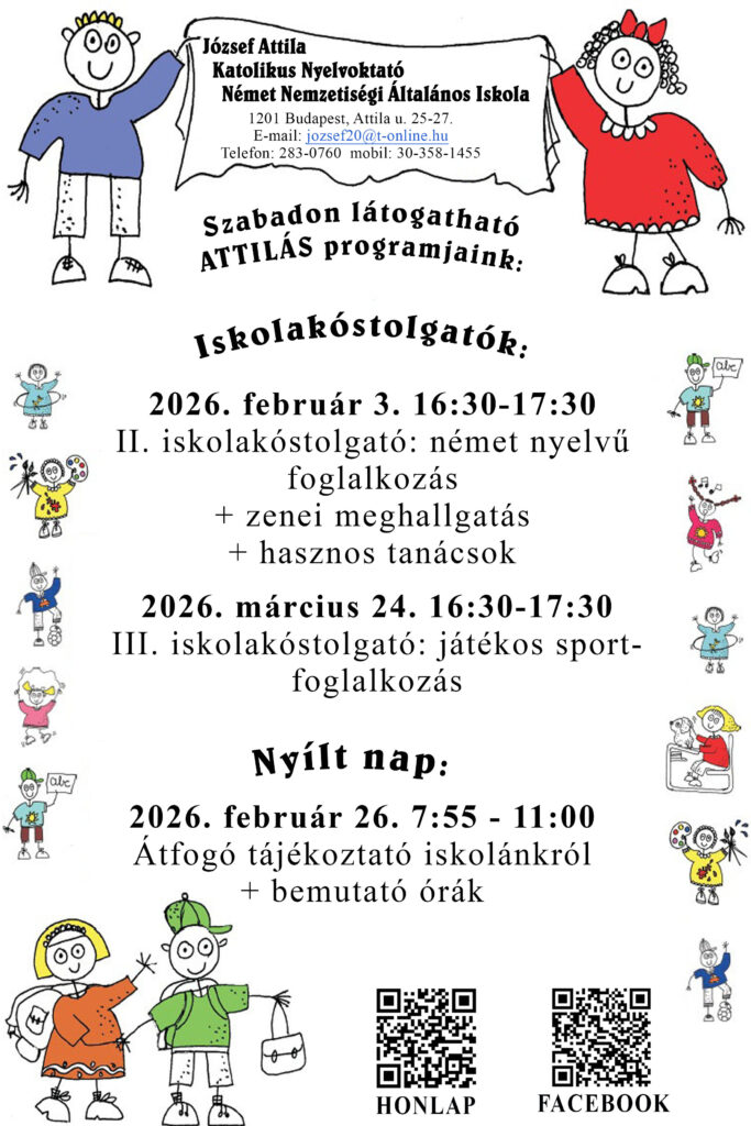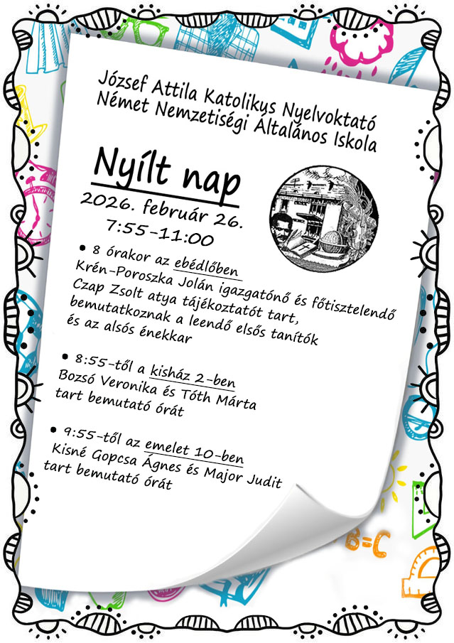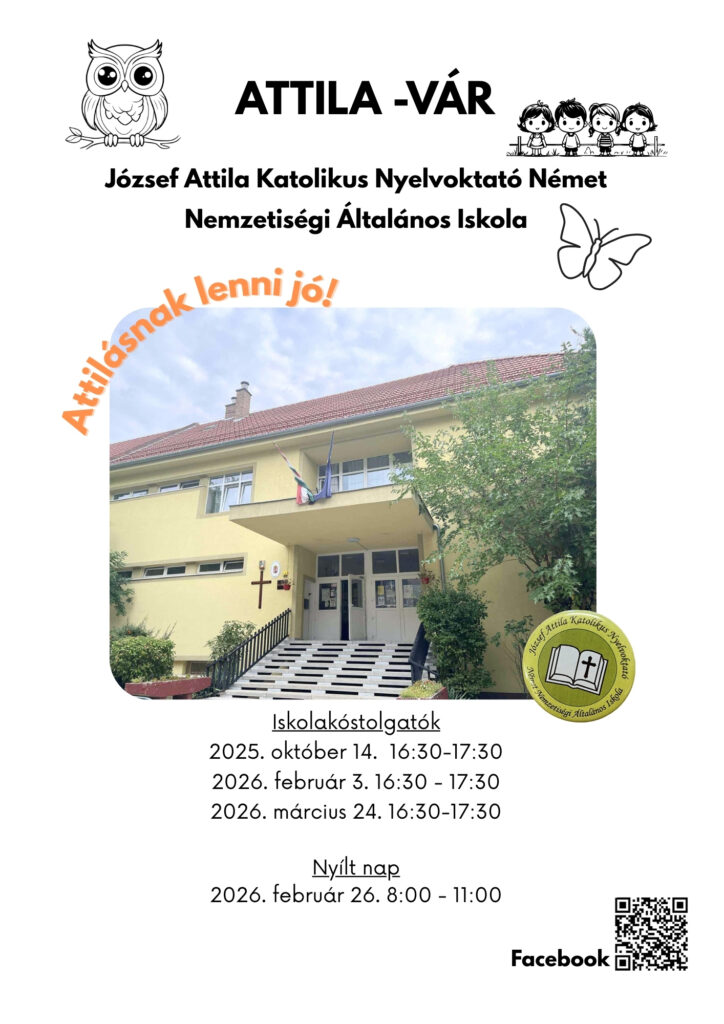 A József Attila Katolikus Nyelvoktató Német Nemzetiségi Általános Iskola kapui nyitva állnak! Szeretettel hívjuk a leendő kisiskolásokat, hogy egy délelőttre váljanak közösségünk részévé.